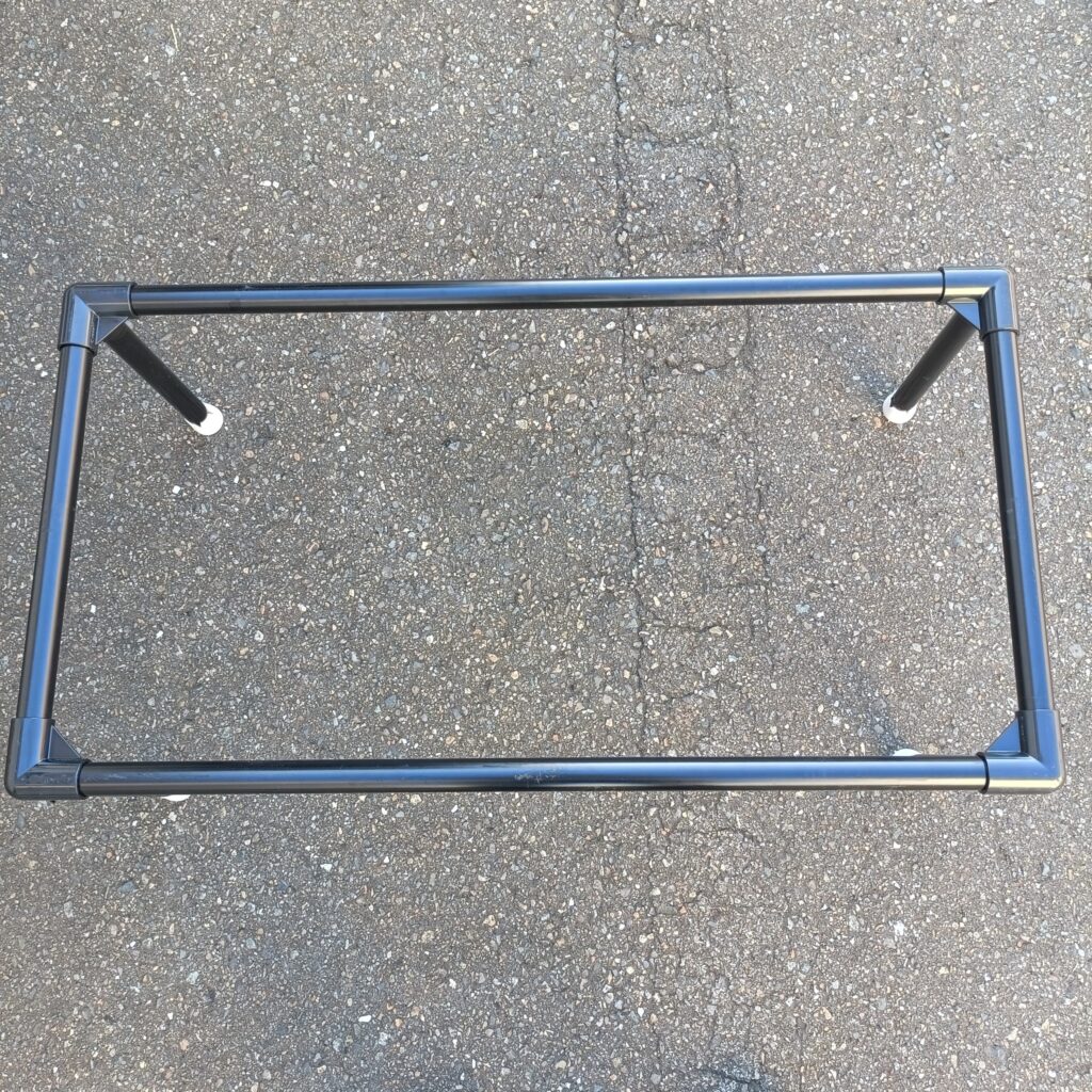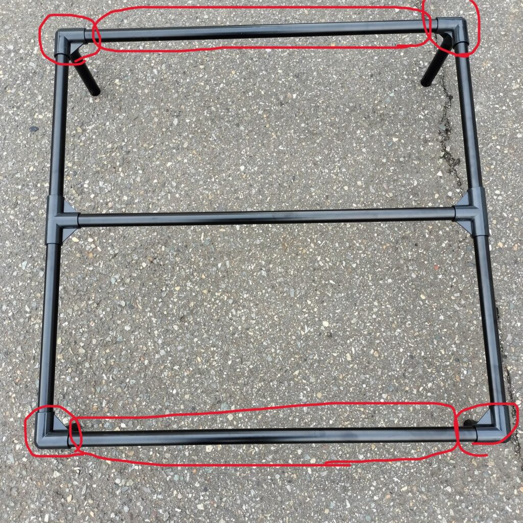 先程天板の裏につけたジョイントに余ったイレクターパイプをつけ収納します 元々の天板にジョイントがあるのでここに残りのパイプを固定しておきます。 80cmのパイプ(長いパイプ)を内側に固定します *端に固定すると角のジョイントに干渉します