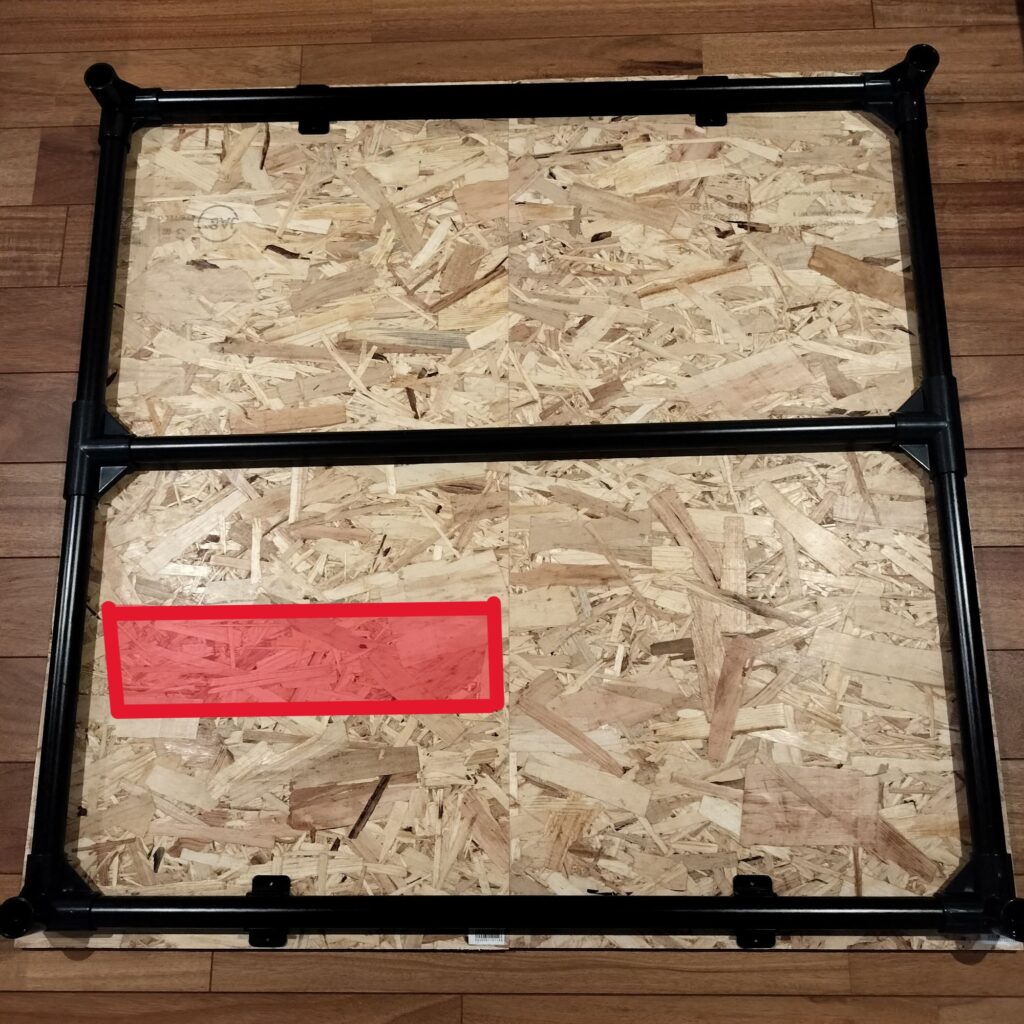 今回から作る方は以下をカットして、前回記事を参考に天板の裏面にジョイントパーツを取り付けてください